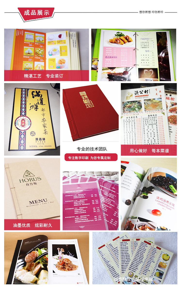 我們一直為各類酒店、酒樓、酒吧、咖啡廳、夜總會(huì)、高級(jí)會(huì)所等餐飲場(chǎng)館,提供菜譜、酒水單的訂制服務(wù),為個(gè)性化風(fēng)格特別工藝的菜譜制作要求,提供有別于競(jìng)爭(zhēng)者的完整解決方案。
